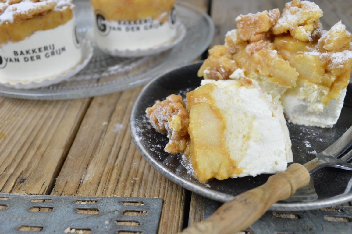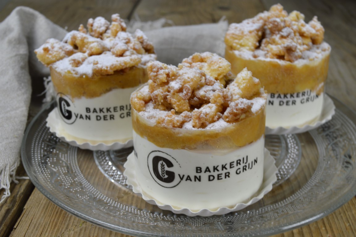 Allereerst al de dunne crunchy bodem van witte chocolade met een krokant knispertje van amandelen. Daarop een flinke laag luchtige roomkaas en een plakje zachte kapselcake. Daar bovenop een stevige en smaakvolle appelcompote. En tot slot een royale laag krokante koekkruimels, bestrooid met poedersuiker.
