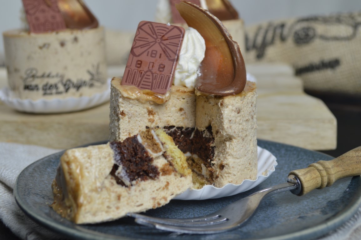Specialiteit onder de gebakjes, die je echt eens geproefd moet hebben: Speculaas gebakje, volgestopt met de lekkerste verrassingen. Een speculaaskoekbodem met daarop chocolade brownie en daaromheen heerlijk luchtige bavaroise met speculaassmaak. Op de brownie ligt een klein speculaasje die gedoopt is in de witte chocolade. Het gebakje is mooi opgemaakt met een cremetoef en chocolade. Â Dit is in het kort de smaaksensatie voor het najaar. Eigenlijk is hij te mooi om op te eten, maar toch zeggen wij: Smullen maar!